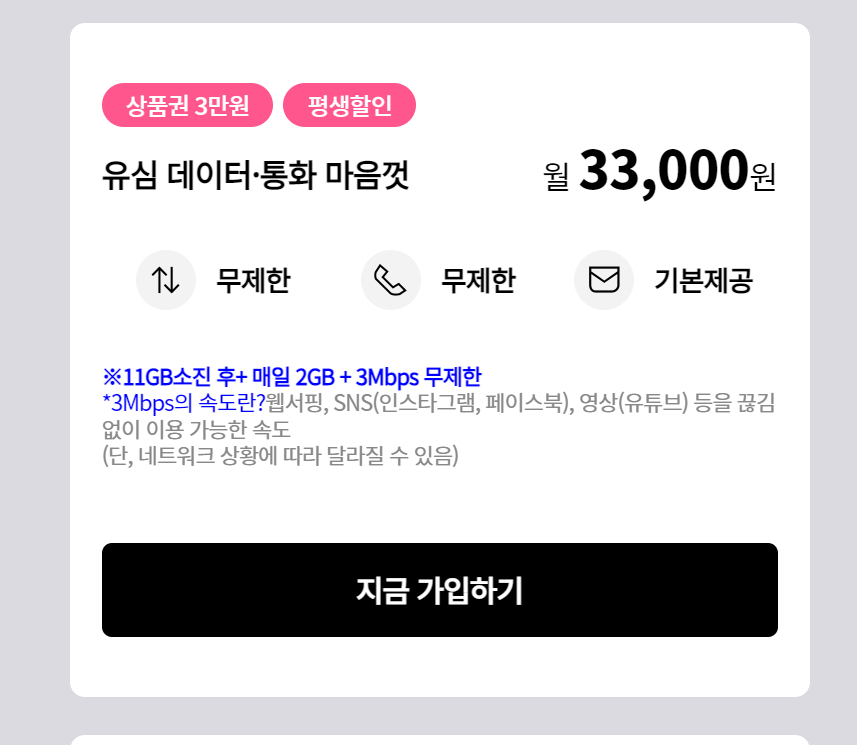 알뜰폰 요금제는33000원에 통화 데이터를 무제한으로 사용할 수 있고