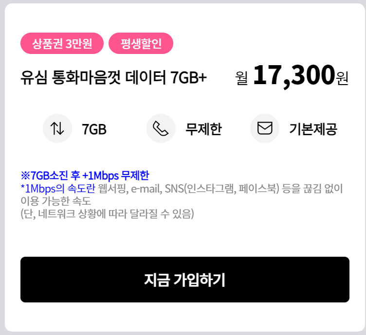 통화는 무제한으로 이용하고 데이터는 7기가 사용하는 조건으로 17300원짜리 요금제