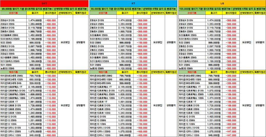 공시지원금으로구매시할인되는 가격을 안내하는표입니다